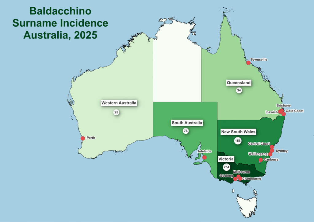 forebears.io estimates that, in 2025, there were 531 people with the surname Baldacchino, 11 with Baldachino and 3 with Baldaccino in Australia. The very few spellings other than Baldacchino are likely to be simple misspellings in the sources for frequency today, e.g. phone directories, voter lists and the like. Also, the complete absence of the variant name Ballacchino is a good indicator that the Baldacchinos in Australia came mostly from Malta rather than Sicily since the Ballacchino spelling is so prevalent in Italy. Australian Baldacchinos are clustered in the vicinity of Australia’s major cities along the coast, with Greater Melbourne in Victoria the preference of almost half of all Baldacchinos in the country.