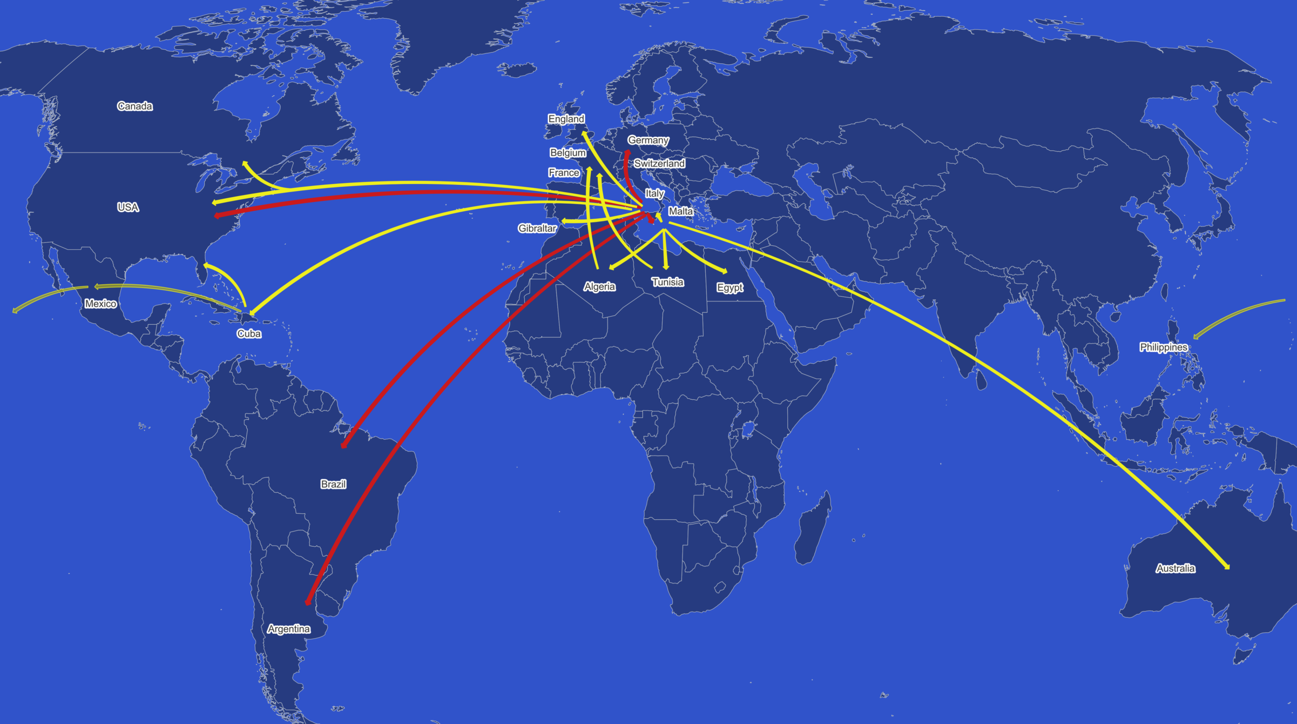 Major overseas emigration routes for the Baldacchino and variant surnames. Red routes identify mainly Sicilian emigrants, yellow routes Maltese emigrants.