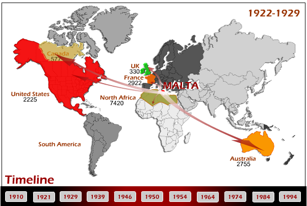 Maltese emigration 1922-1929 from maltamigration.com. Note that the migration charts which were interactive on the maltamigration.com website are no longer available since the end of support for Flash technology.