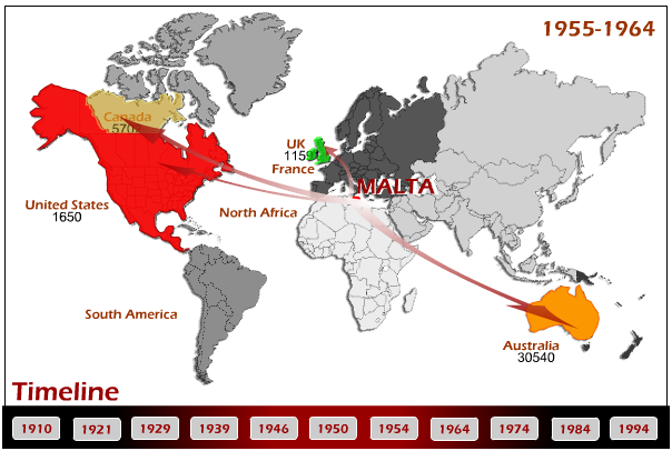 Maltese emigration 1955-1964 from maltamigration.com. Note that the migration charts which were interactive on the maltamigration.com website are no longer available since the end of support for Flash technology.