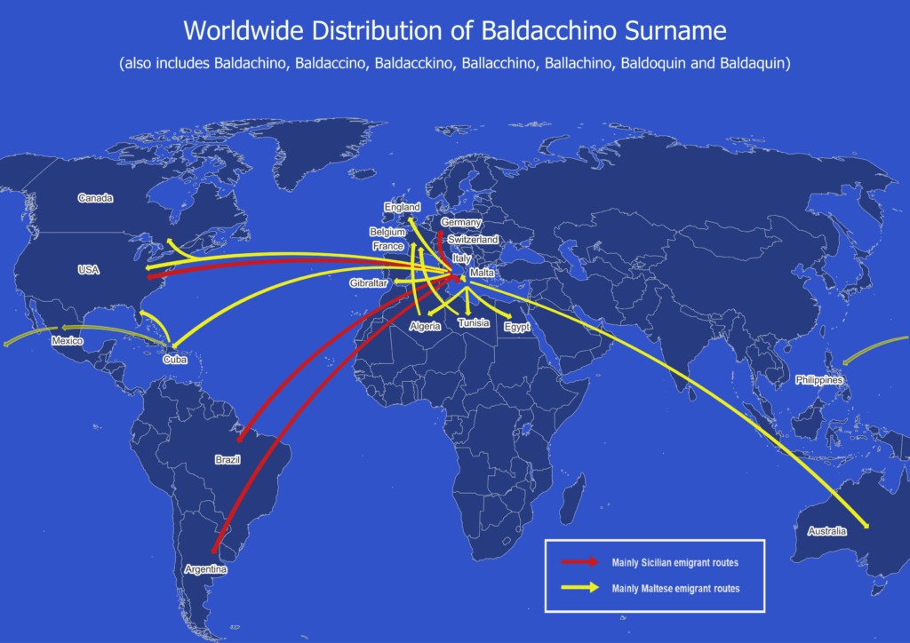 The map below identifies the major routes of Baldacchinos and variant names emigrating overseas. Red routes indicate a preponderance of Sicilian emigrants while yellow routes indicate a preponderance of Maltese emigrants. There may well be both Sicilian and Maltese emigrants in most of the countries highlighted but we believe that one or the other nationality is more prevalent based on the evidence we currently have. After several centuries of the names spreading within Italy and Malta, more evidence of overseas movement becomes available. More detail at the points of origin and destination of each route may be found on the Country tabs.
