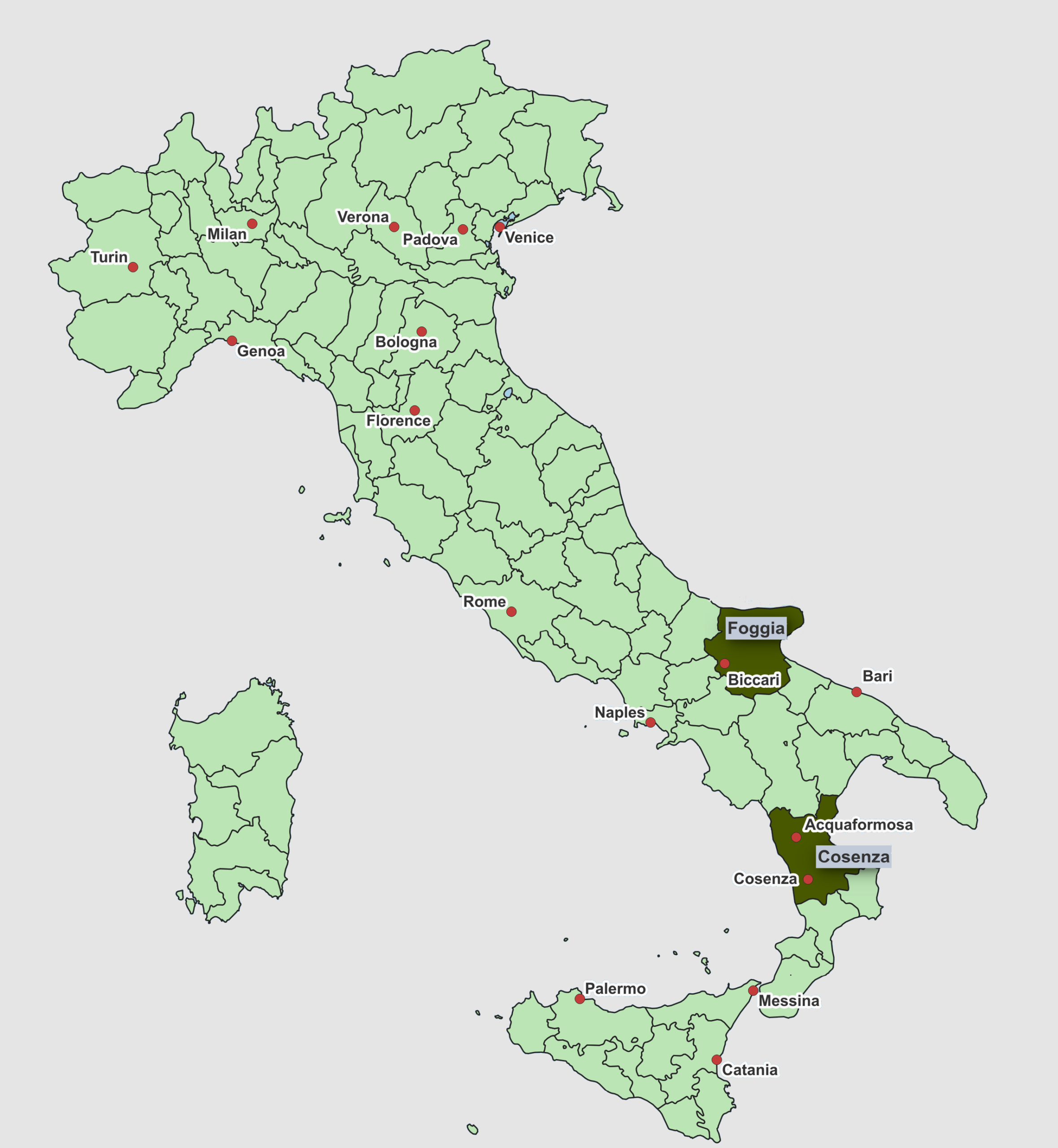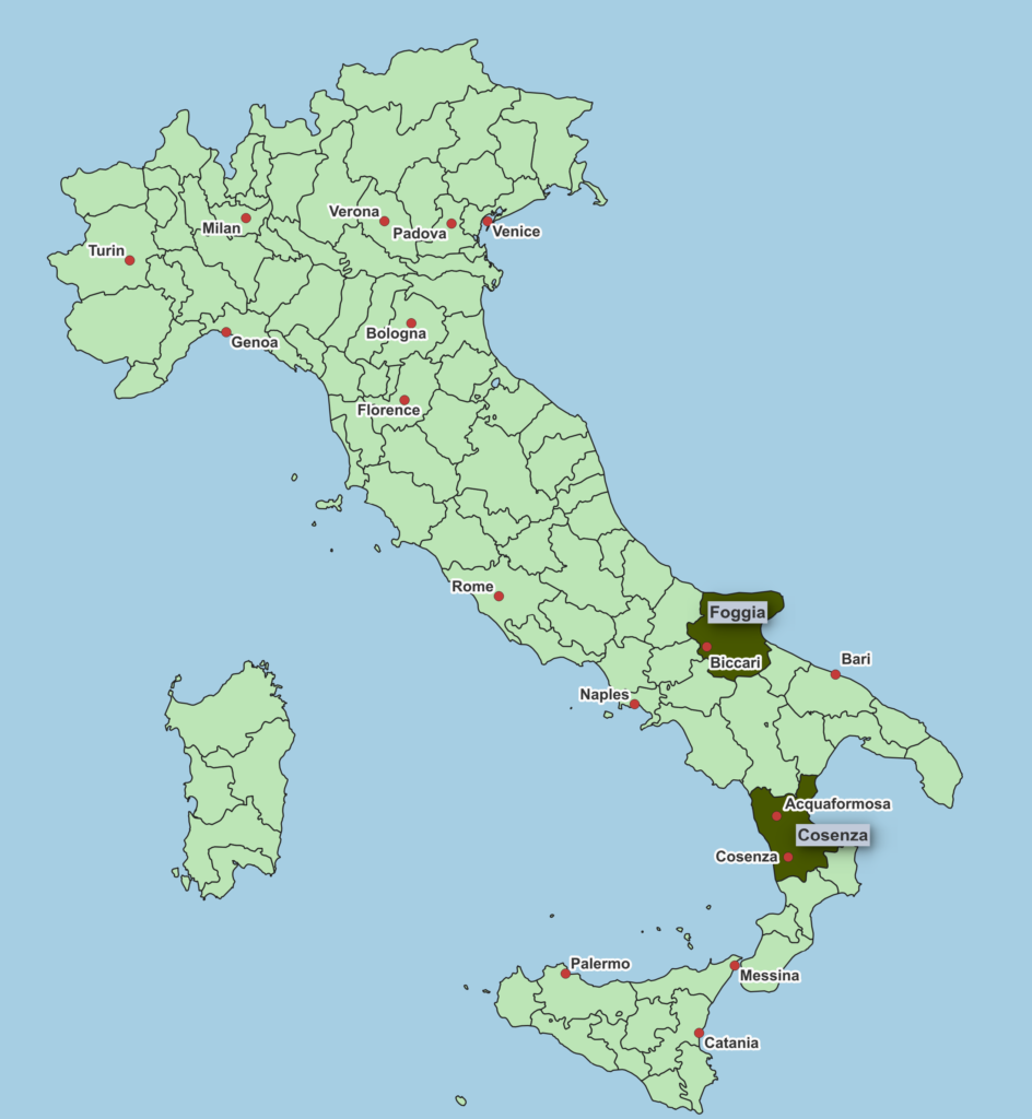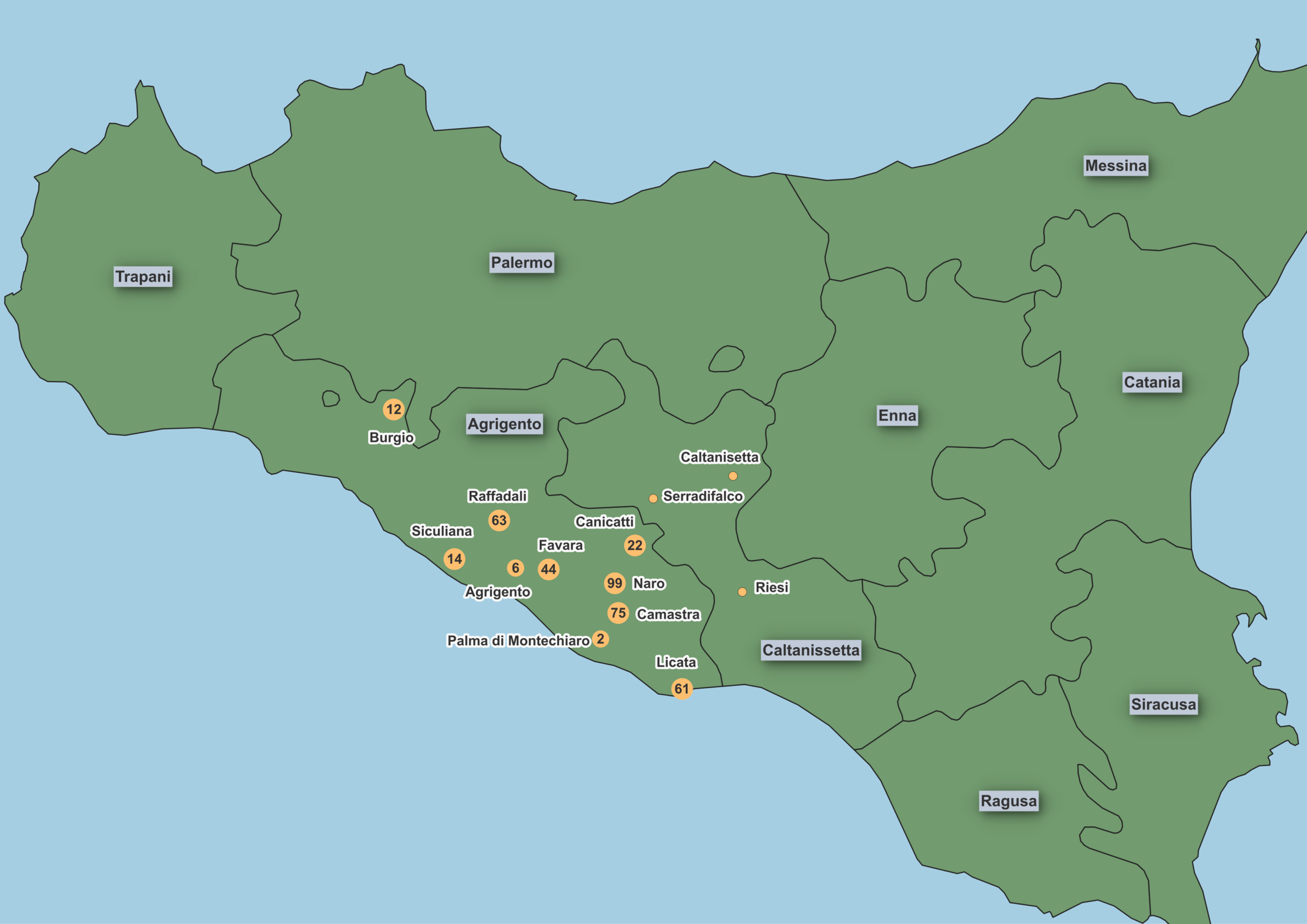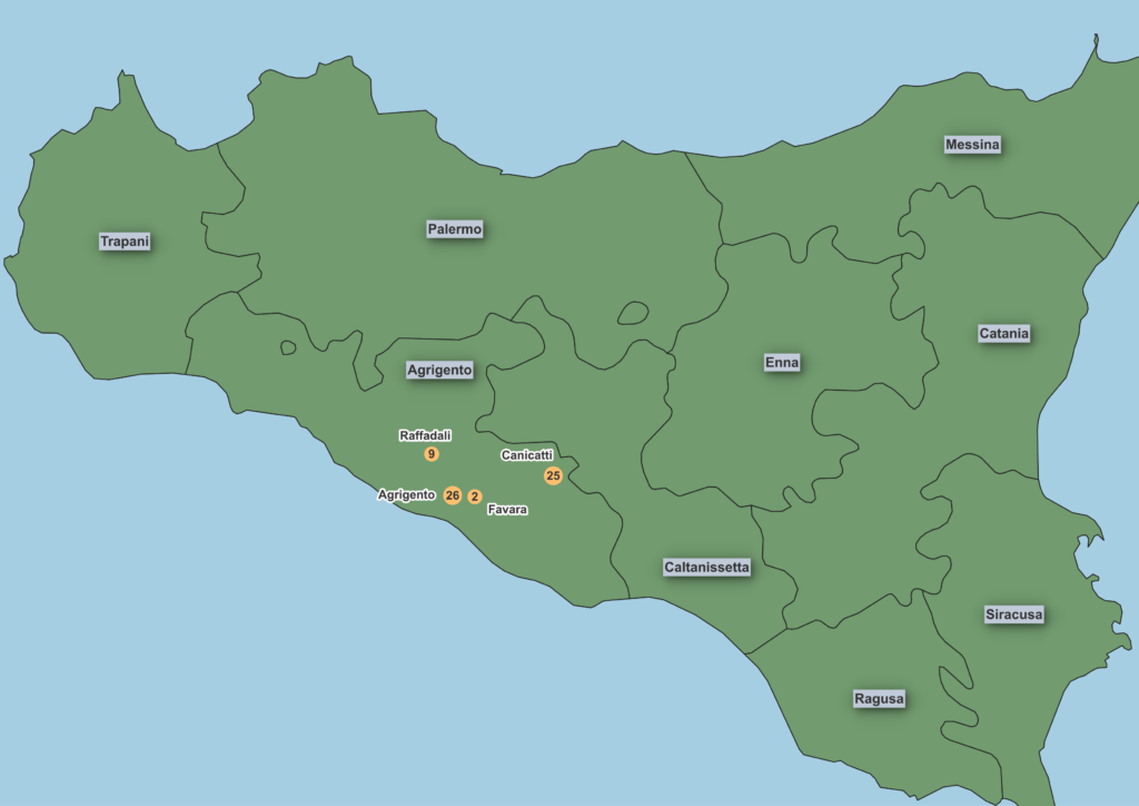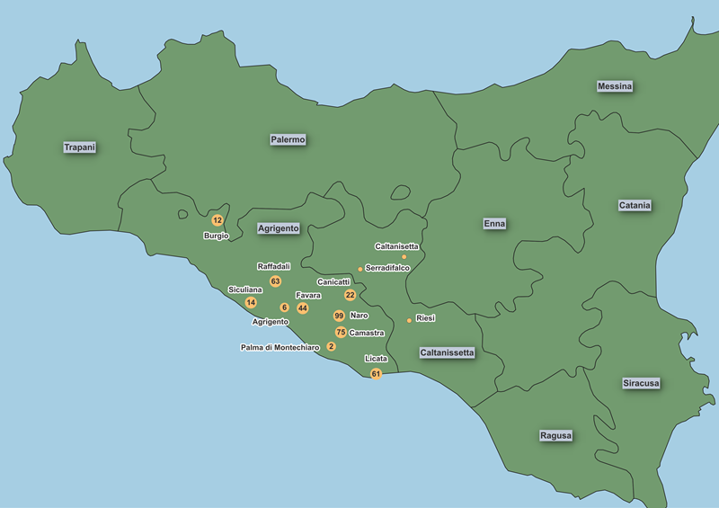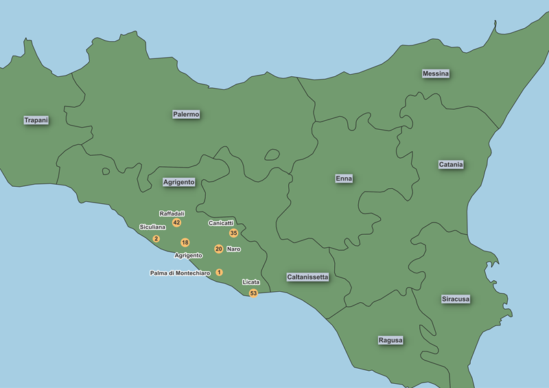 Note that civil birth registrations for Italy are widely available for the period 1820-1865 and that these registrations have been used to supplement missing or severely damaged baptism registers in Licata, Naro and Raffadali during the 19th century. These registrations have also been used to identify locations beyond Agrigento Province since baptism registers are not yet available online for other locations. Numbers are not shown in these other locations though because, although some civil registrations are available up to 1925, they are very incomplete after 1865.