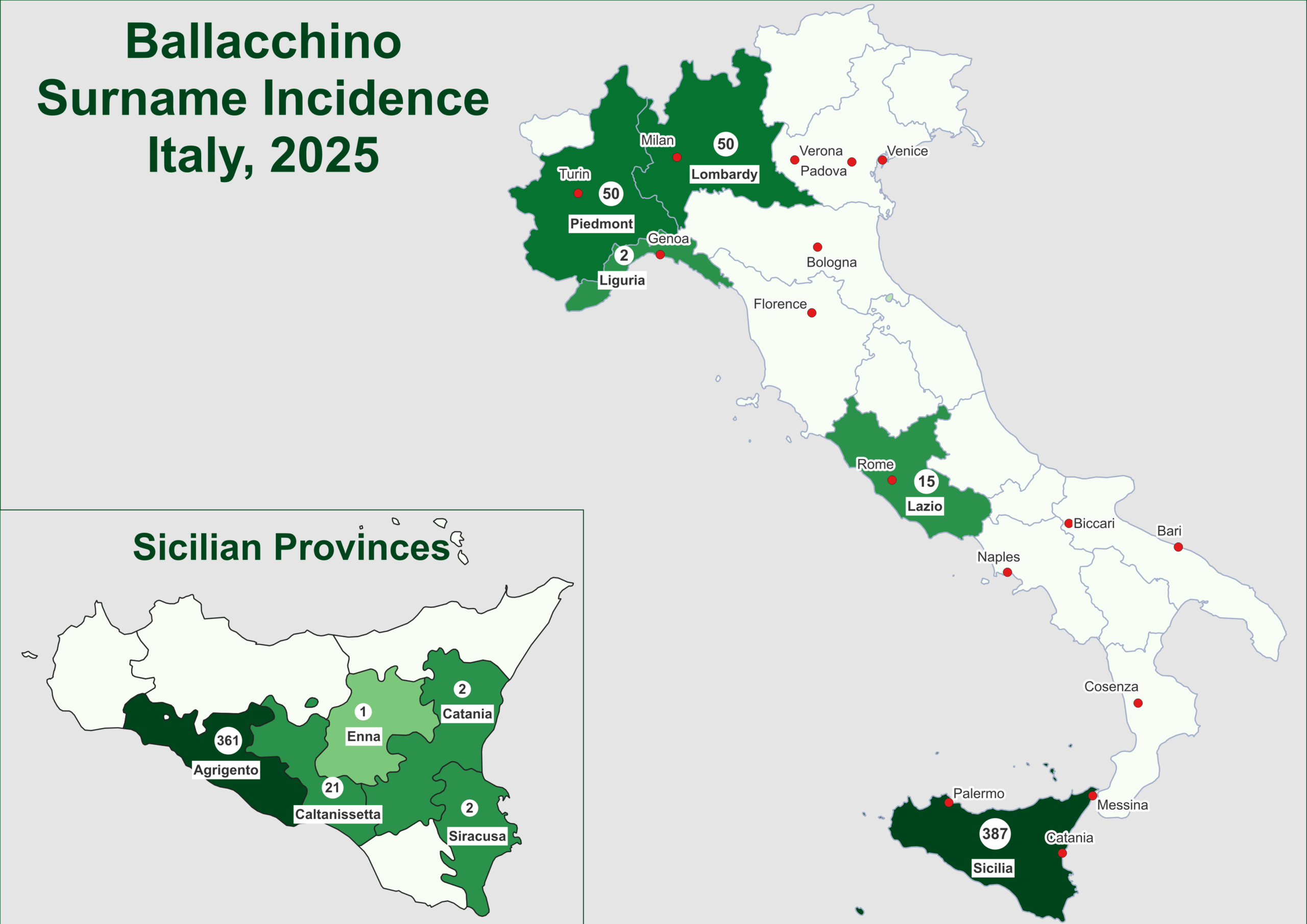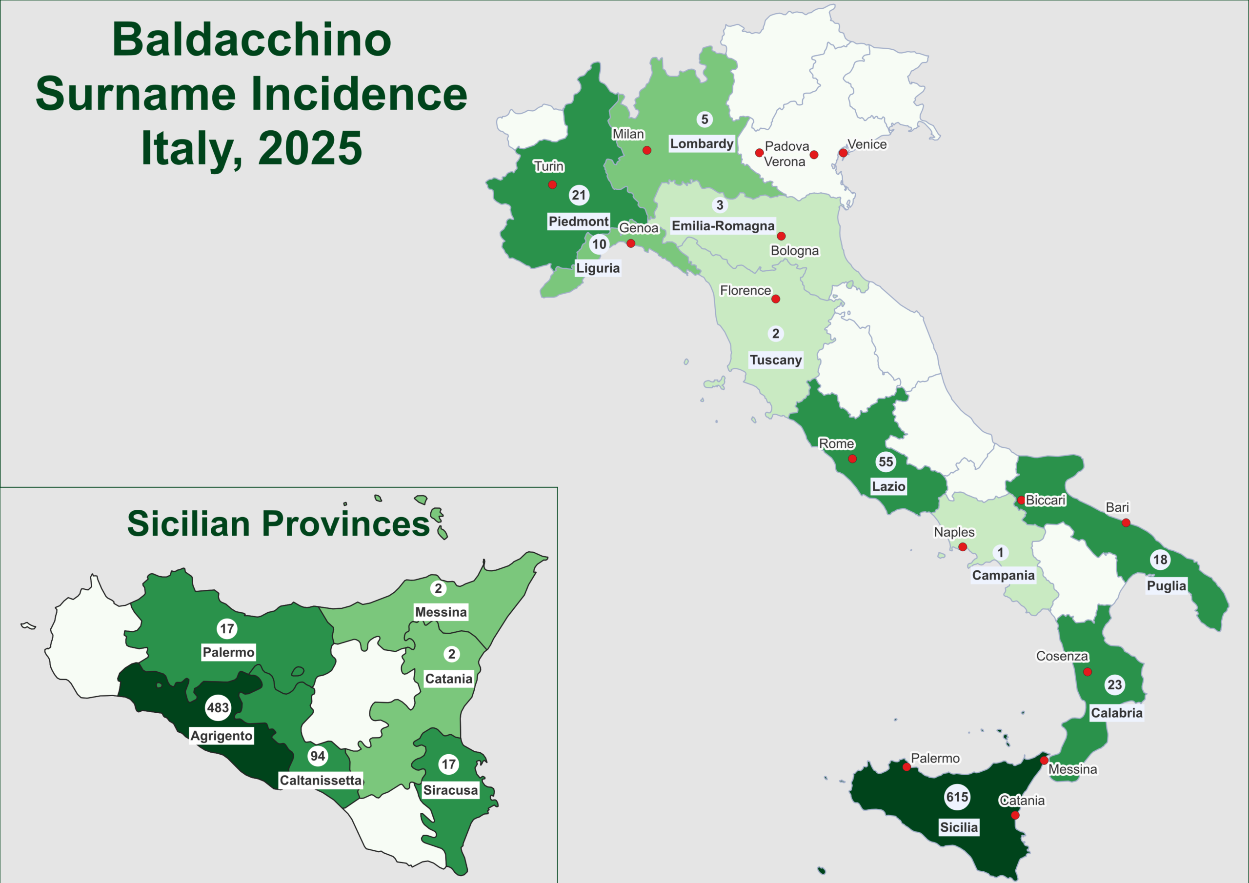 Forebears.io estimates that, in 2025, there were 753 Baldacchinos, 1 misspelled Baldachino and 504 Ballacchinos in Italy. Baldacchino is the earliest form of the name and still the most prevalent form. Although it has now spread the length of the country, the great majority of Italian Baldacchinos still live in the Agrigento Province of Sicily where the name originated likely in the 12th to 13th centuries. In the Agrigento Province, the most popular residence today is Naro, with significant numbers also in Favara and the city of Agrigento. On the Italian mainland, the most popular residence is in the vicinity of Rome but the name can be found in most provinces stretching from Milan and Turin in the north to the Province of Calabria in the south.