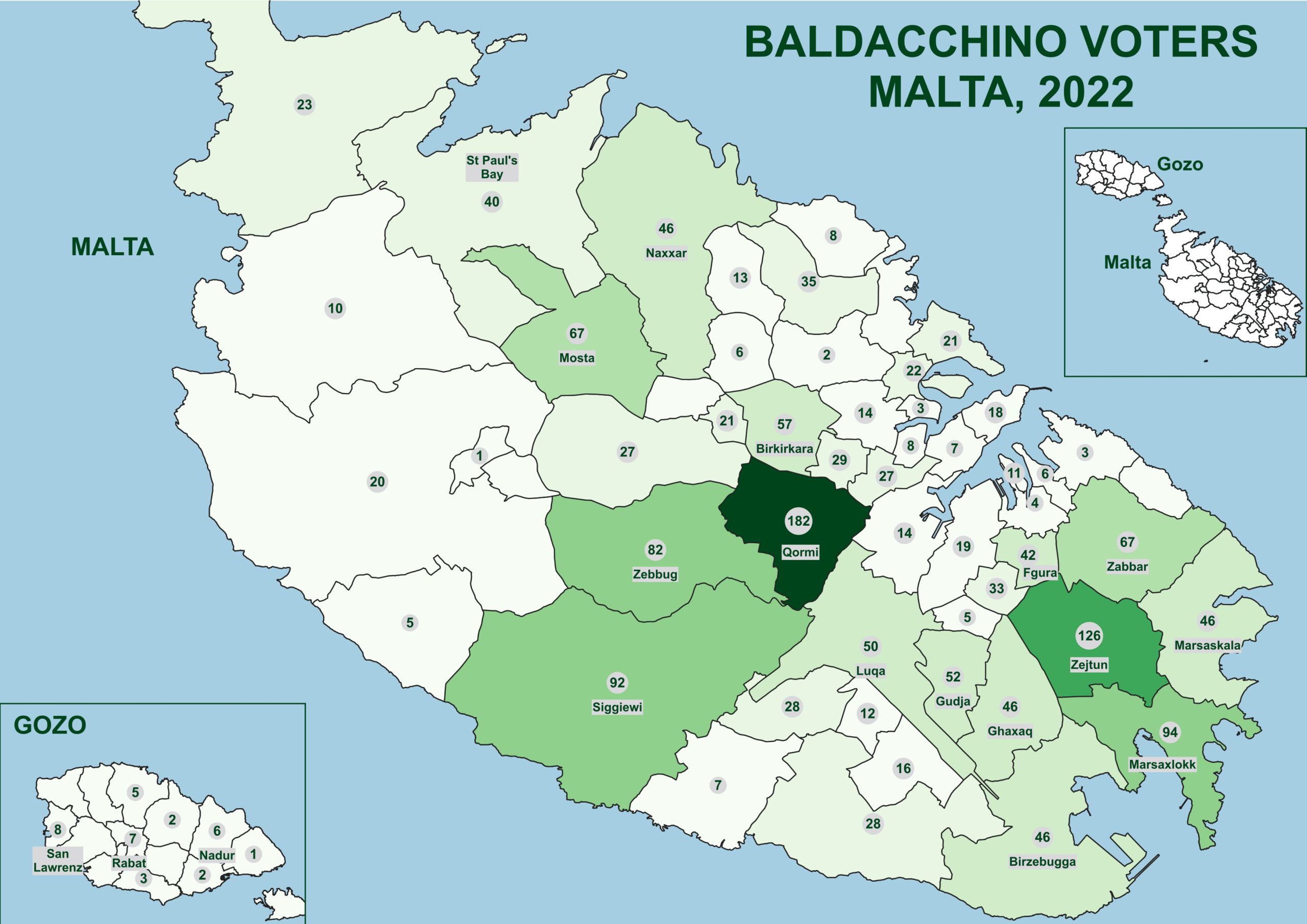 forebears.io estimates that, in 2025, Malta had 2111 people with the surname Baldacchino, with another 18 reported as Baldachino. Those with the spelling Baldachino are undoubtedly misspellings. We believe that this is a good estimate since we know from the 2022 Malta Electoral Rolls, available from the National Library and available online to those with Maltese identification cards, that there were 1675 registered Baldacchino voters with at least another 90 having Baldacchino as part of a double surname such Baldacchino Kerr or Gatt Baldacchino. Voting participation is very high in Malta and open to those 16 and over, so these numbers should be a fair reflection of the adult population in 2022.