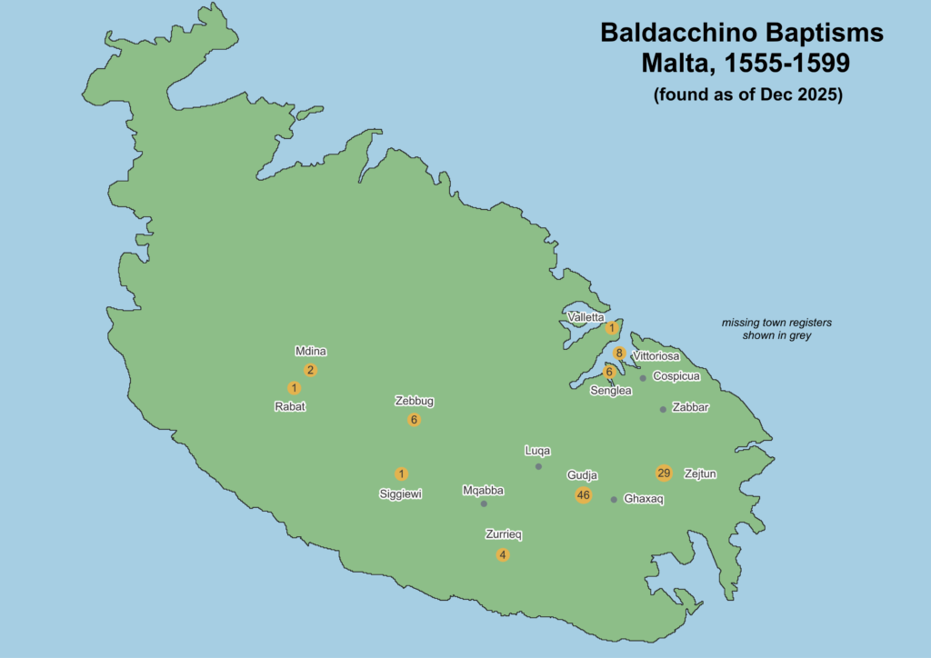 The only sources used at present to show internal movement in the 16th-19th centuries are church registers but they provide more of an indicative picture rather than a complete one since there are major gaps in the registers accessible online. Note any internal movement is very short-distance given that the island of Malta is only about 17 miles long and 9 miles wide. The charts below show the baptisms we have found to date with missing registers likely to contain Baldacchino baptisms shown in grey. In addition, for the period 1550-1599, a number of the registers do not begin until the 1570s-1590s. Still it is apparent that the families remained largely in the southeast at the start of the registers but had begun spreading north and west. The Knights of Malta had been given the island in 1530 and Baldacchinos began moving toward the Knights’ first administrative centre in Cospicua (Birgu). Following victory in the 1565 Great Siege of Malta by the Ottomans, the Knights quickly began building Valletta, overlooking the Grand Harbour, which would become their new administrative centre and remains the capital of the country today.