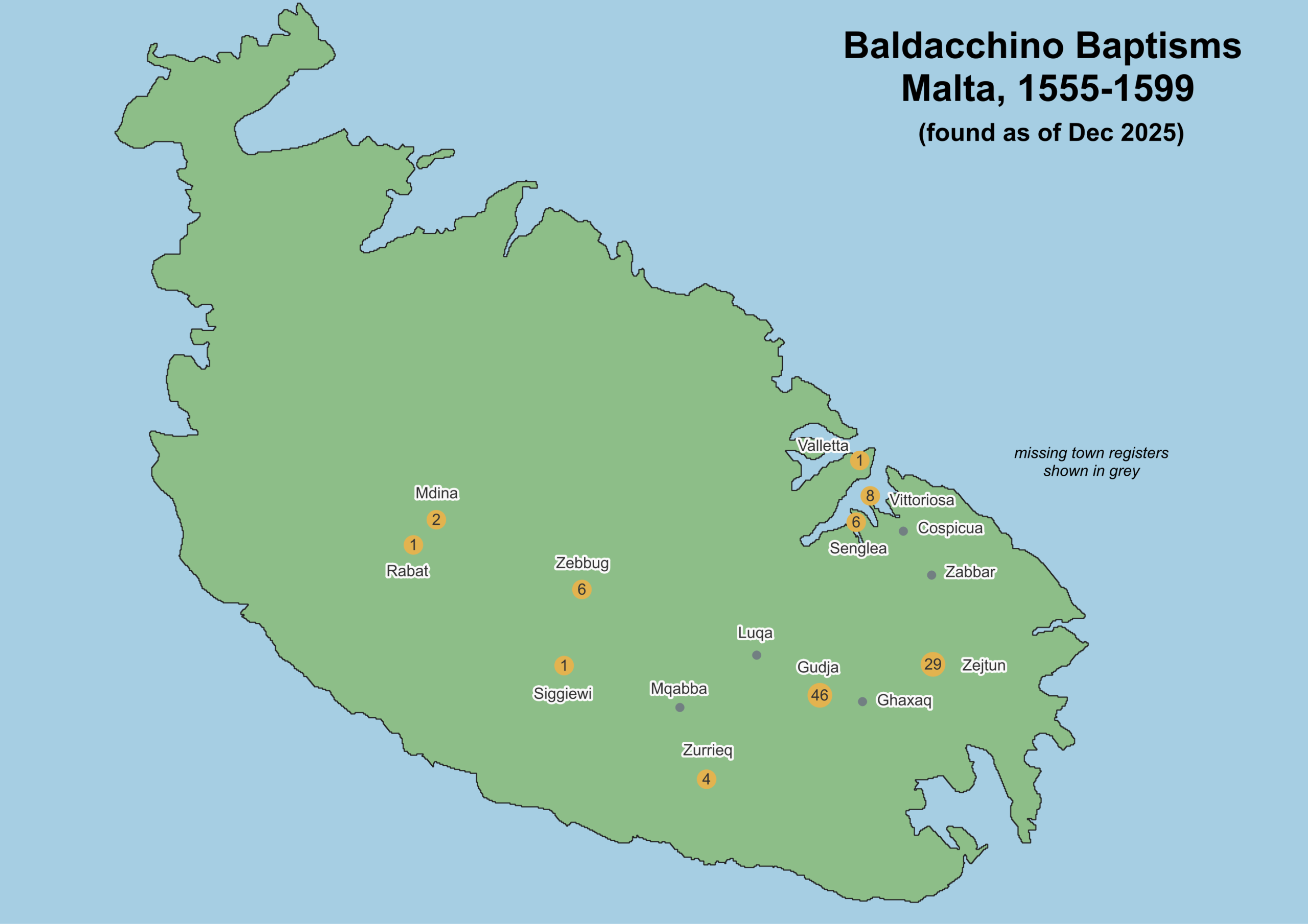 Two 15th century documents were introduced by G Wettinger in the late 1960s that provide a remarkable starting point for research on surnames in Malta, a 1419-20 militia list and a 1480s angara list containing the names of those who were required to participate in public works on a scheduled basis (G Wettinger, ‘The distribution of surnames in Malta in 1419 and the 1480’s’, Journal of Maltese Studies, vol 5 (1968), pp. 25-48 and G Wettinger, ‘The militia list of 1419-20 : a new starting point for the study of Malta’s population’, Melita Historica, Vol 5, No 2 (1969), pp. 80-105). The lists have their limitations including the omission of Vittoriosa (Birgu) and Gozo from both lists and the loss of Zabbar, Zejtun and Ghaxaq from the 1480s list. The loss of these last three villages is almost certainly significant for the Baldacchino surname because they are three of the four villages that Baldacchinos were located in at the time of the 1419-20 list. The lists include able-bodied men age 16 to 60 available for military or public works duty, with a ratio suggested by academics of 5 or 6 family members for each household in the list (4 in 1419-20). They identify five men with the surname ‘Baldakin’ living in four villages in 1419-20 and another five in the 1480s living in five villages slightly west overall of the earlier villages no doubt due to the eastern-most villages being lost from the list. Like other Sicilian settlers at this time, the Baldacchinos were concentrated in the southeast of the island of Malta. Also, despite the omissions, the lists leave little doubt that the Baldacchinos were in Malta by the mid-1300s and further academic analysis suggests that the surnames that came from Agrigento Province, Sicily including Baldacchino may have been in Malta even earlier. We haven’t yet seen the forenames of those in the 1480s list yet but our own ancestor, Mario of Gudja born in the mid-1400s, seems likely to have been amongst these families. Note that Johanni et Buzubudi is now Gwann and Bisbut, parts of Zejtun. Axac is modern-day Ghaxaq, Percopu is Kirkop and Micabibe is Mqabba.