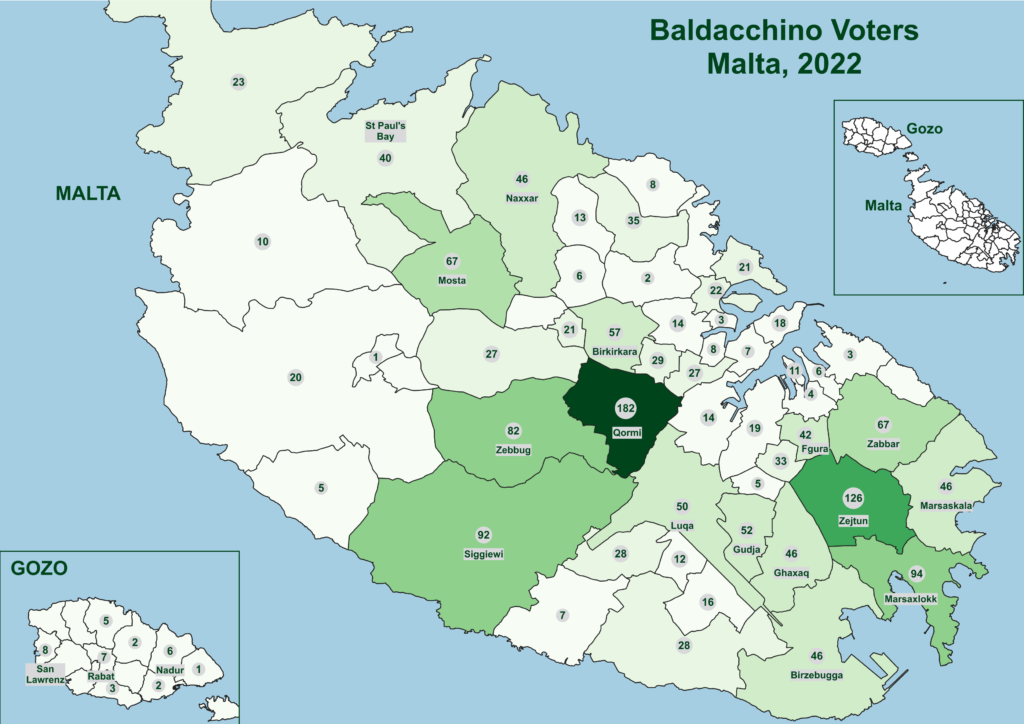 Forebears.io estimates that, in 2025, Malta had 2111 people with the surname Baldacchino, with another 18 reported as Baldachino. Those with the spelling Baldachino are undoubtedly misspellings. We believe that this is a good estimate since we know from the 2022 Malta Electoral Rolls, available from the National Library and available online to those with Maltese identification cards, that there were 1675 registered Baldacchino voters with at least another 90 having Baldacchino as part of a double surname such Baldacchino Kerr or Gatt Baldacchino. Voting participation is very high in Malta and open to those 16 and over, so these numbers should be a fair reflection of the adult population in 2022.