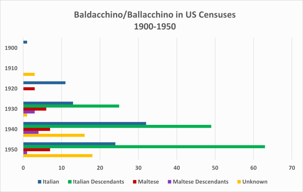 The re-unification of Italy in 1861, termed Risorgimento, resulted in an economic downturn in southern Italy and especially Sicily along with heavy impacts due to a new requirement of seven years of military service. Between 1900 and 1915, over a million Sicilians or almost a quarter of the island’s population, emigrated with about 90% choosing the United States. The earliest records found to date for Baldacchino and Ballacchino migrants begin with the arrival of Angelo Ballacchino at Ellis Island, New York in 1892, signalling the beginning of the first wave of migration of Baldacchino and related surnames to the USA. Italian migration dropped sharply with the introduction of the Johnson-Reed Agreement in effect from 1924 to World War II, an agreement that severely curtailed the number of Italians and other Southern Europeans allowed to enter the United States. However, the presence of these surnames was already well-established with the overwhelming majority arriving from Sicily. For the Ballacchino surname, most were still from the town of Licata, Agrigento, Sicily where this variant surname originated. Census records, available to 1950, identify the impact of this initial wave of migration, with most Baldacchinos and Ballacchinos having become the children and grandchildren of native Italians by the time of the 1950 census. In 1950, these emigrants and their descendants were residing primarily in New York (40%) and Ohio (about 30%). The large group in Ohio were almost all Ballachinos, using a single ‘c’ rather than the double ‘c’ used in Italy.