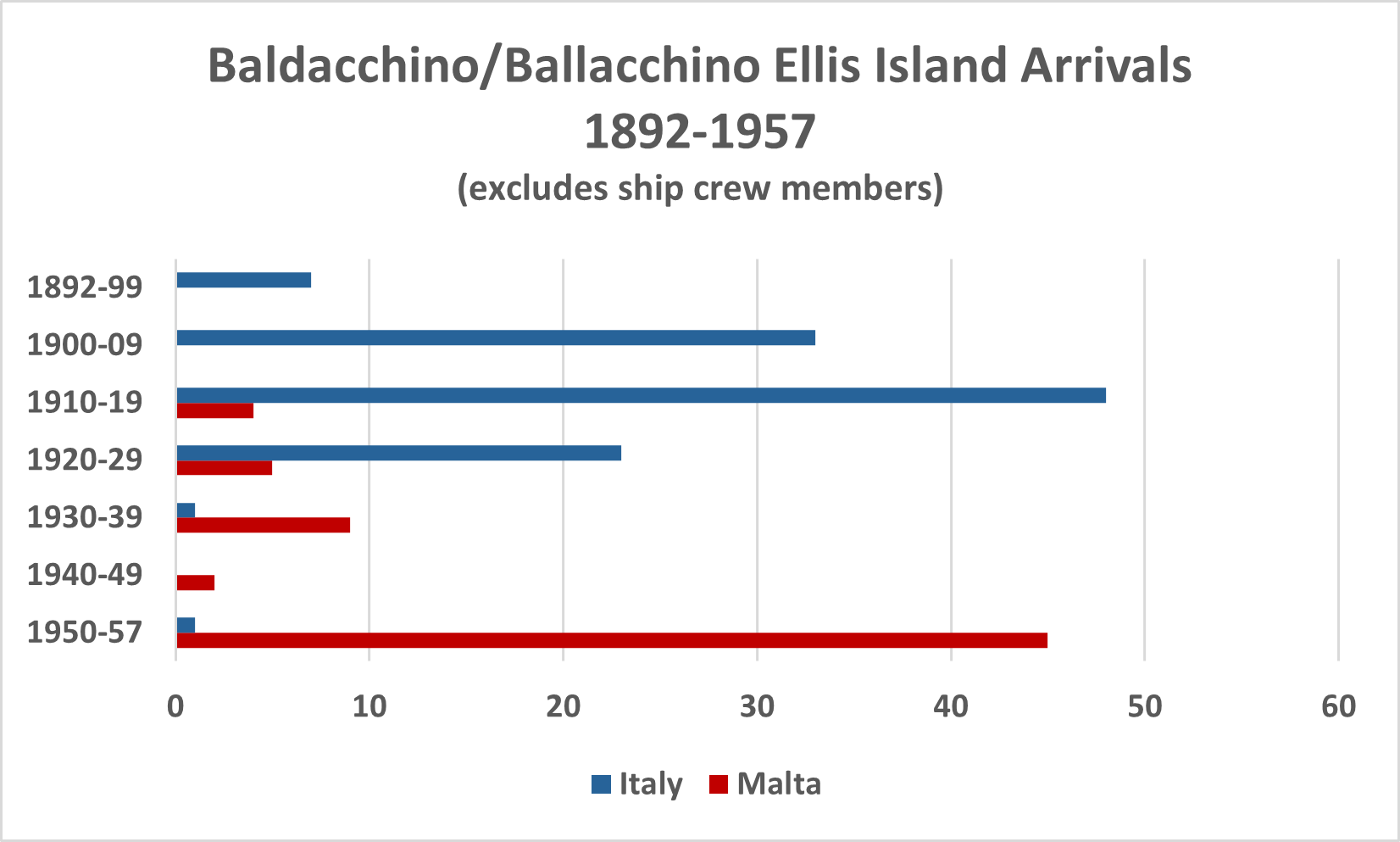 The second wave of migration of Baldacchinos to the USA began slowly just before World War I with the arrival of the earliest migrants from Malta. After World War II, Malta faced an unemployment crisis and began providing financial assistance to those who wished to emigrate. Although Australia was the most popular destination, many also chose the United States. Arrivals of Baldacchinos at Ellis Island, with records available to 1957, show the dramatic shift from Italian arrivals in the early decades of the century to (British) Maltese arrivals in subsequent years. Although arrival records are only sparsely available after 1957, Maltese migration is known to have continued into the 1960s.