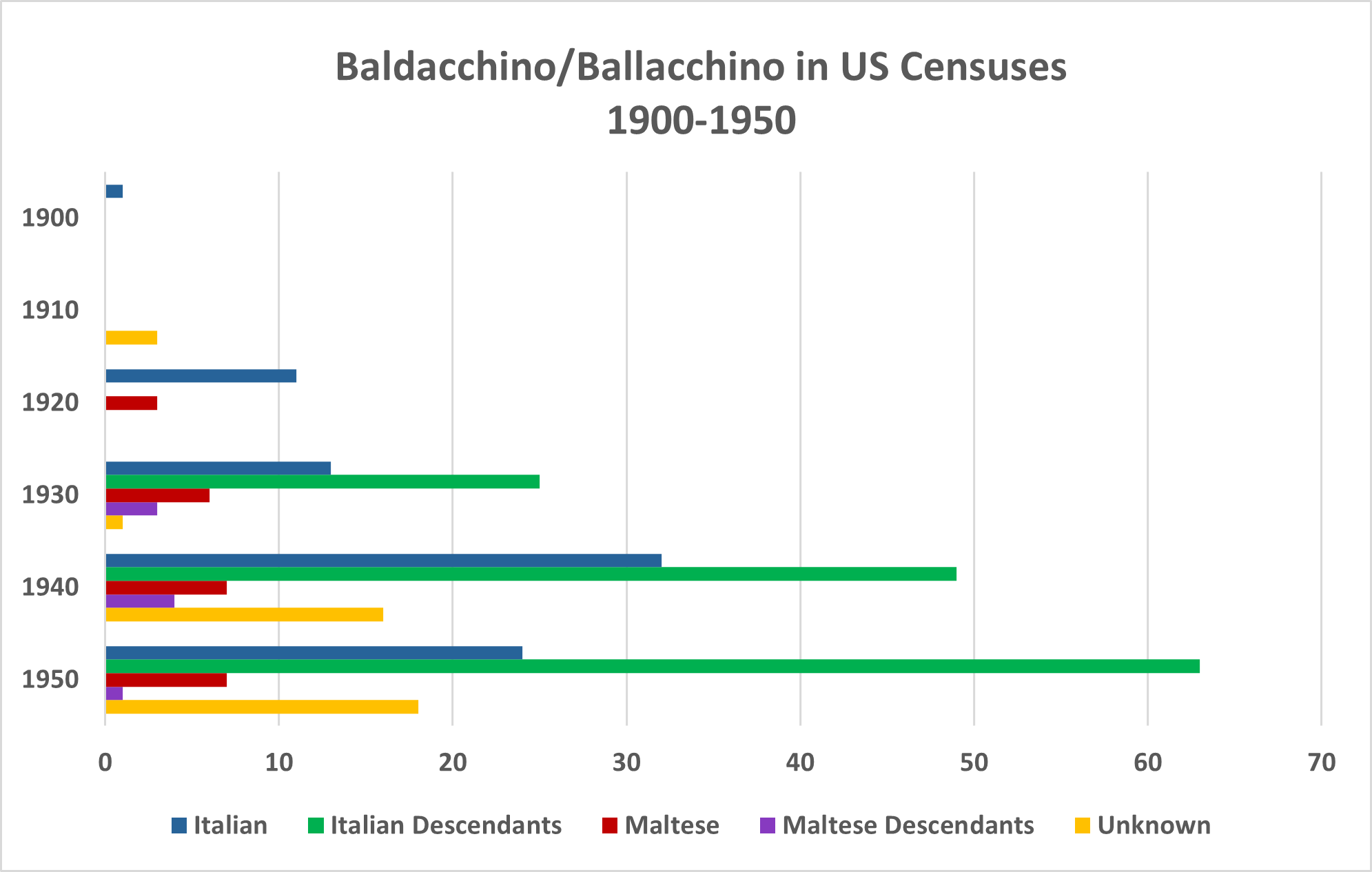 The re-unification of Italy in 1861, termed Risorgimento, resulted in an economic downturn in southern Italy and especially Sicily along with heavy impacts due to a new requirement of seven years of military service. Between 1900 and 1915, over a million Sicilians or almost a quarter of the island’s population, emigrated with about 90% choosing the United States. The earliest records found to date for Baldacchino and Ballacchino migrants begin with the arrival of Angelo Ballacchino at Ellis Island, New York in 1892, signalling the beginning of the first wave of migration of Baldacchino and related surnames to the USA. Italian migration dropped sharply with the introduction of the Johnson-Reed Agreement in effect from 1924 to World War II, an agreement that severely curtailed the number of Italians and other Southern Europeans allowed to enter the United States. However, the presence of these surnames was already well-established with the overwhelming majority arriving from Sicily. For the Ballacchino surname, most were still from the town of Licata, Agrigento, Sicily where this variant surname originated. Census records, available to 1950, identify the impact of this initial wave of migration, with most Baldacchinos and Ballacchinos having become the children and grandchildren of native Italians by the time of the 1950 census. In 1950, these emigrants and their descendants were residing primarily in New York (40%) and Ohio (about 30%). The large group in Ohio were almost all Ballachinos, using a single ‘c’ rather than the double ‘c’ used in Italy.