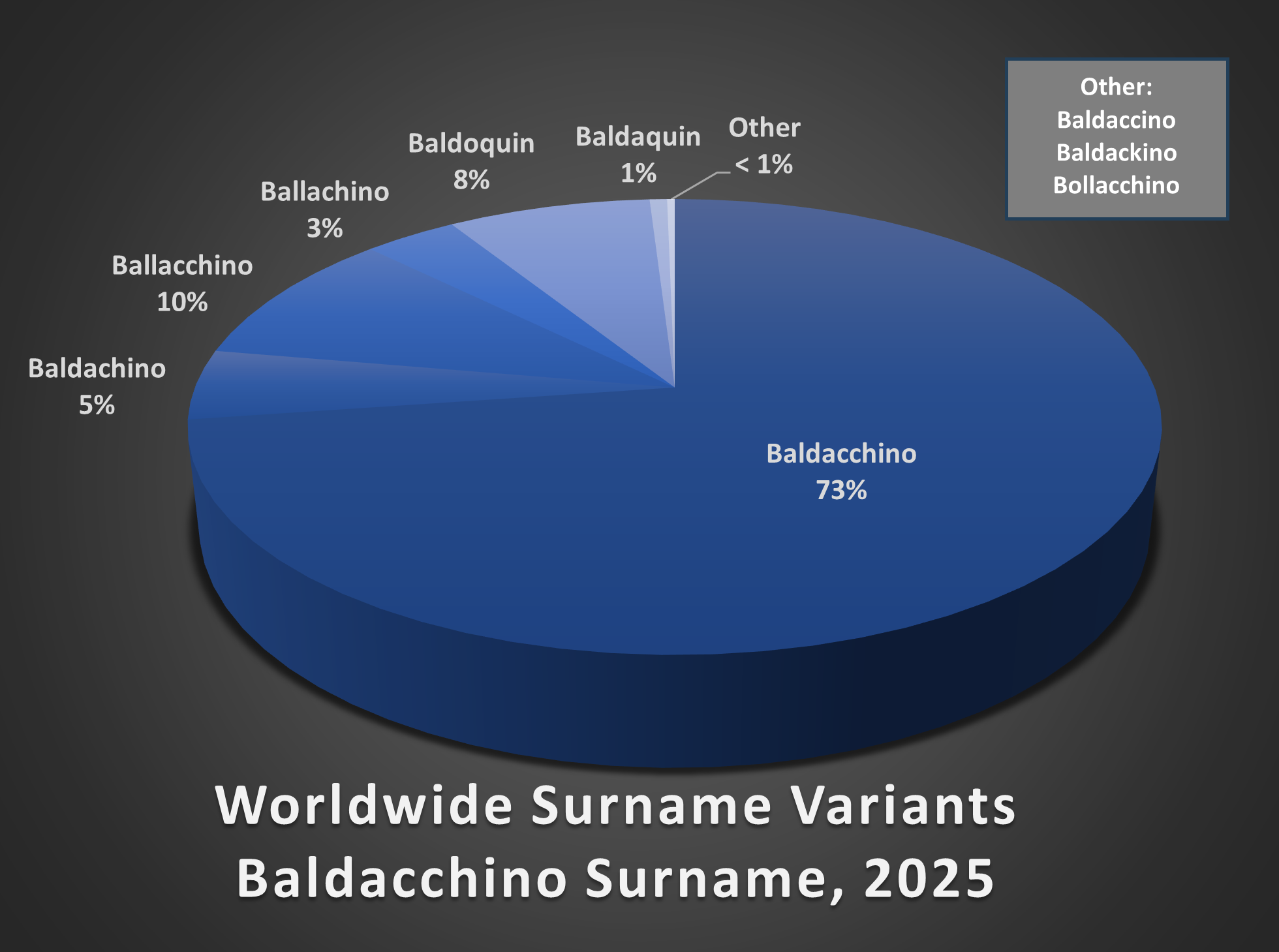 There is another Italian surname, Baldacchini, that appears to be unrelated to the Baldacchino surname. The Baldacchini surname is mainly concentrated in central Italy near Rome and is not part of this study. Also, various spellings of Baldokhina and Valdokhina have been found mainly in Russia and are not likely to be related to the surnames of this study.